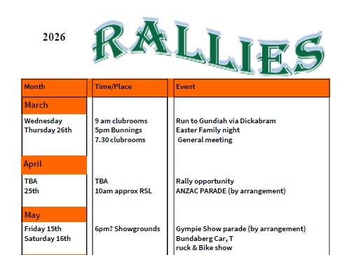 Wednesday 11th – ALL RALLY PLANS CANCELLED DUE TO WEATHER AND ROAD CONDITIONS. Dickabram Bridge and Gundiah Meet at clubrooms 9am. There’s about 15km very good dirt road. BYO morning tea at Dickabram Bridge then on to Gundiah Hotel “Gundy Pub” for lunch. NB If too much rain in lead up days a different rally (all bitumen roads) to a different destination is planned.